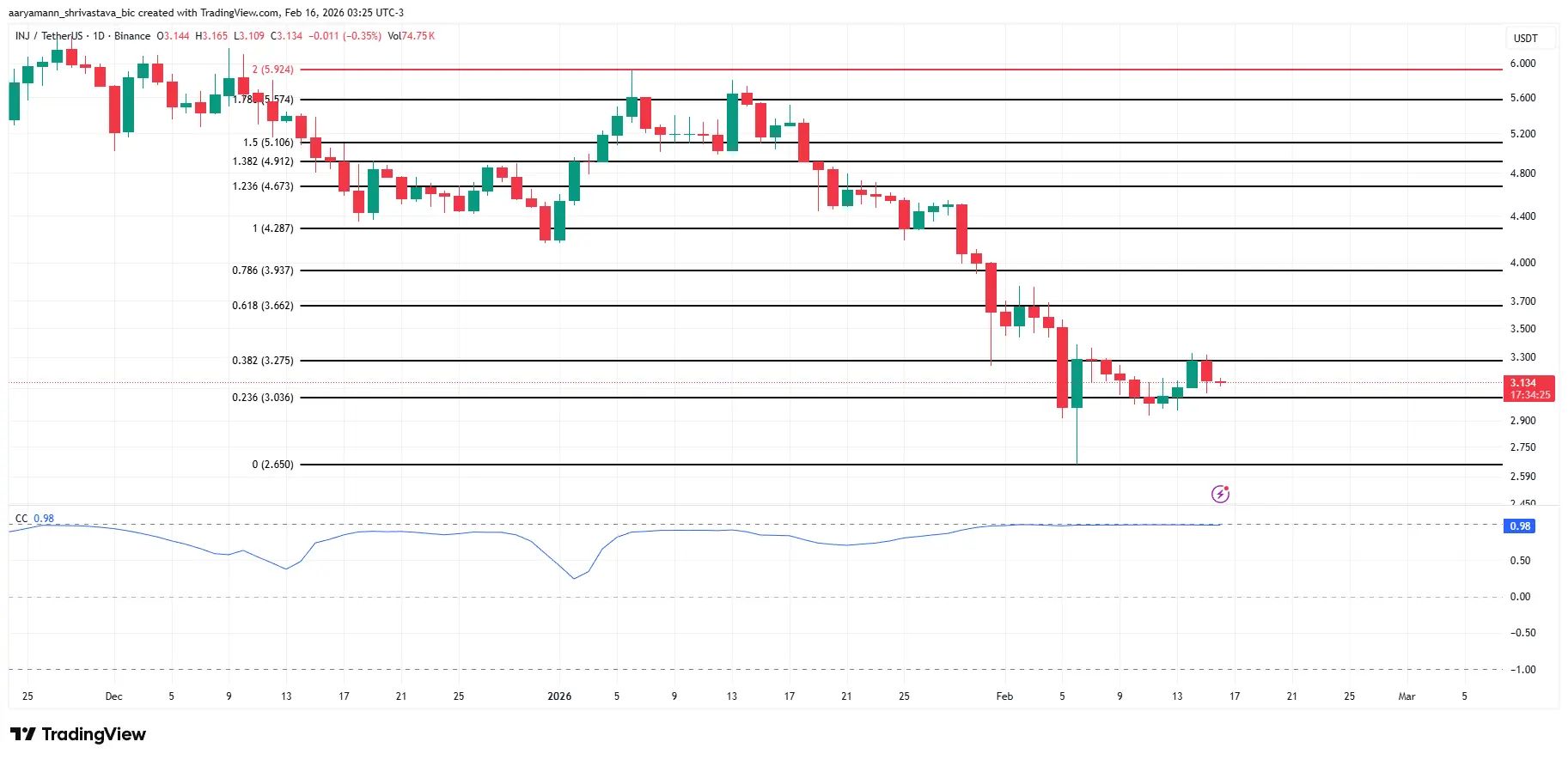 در سمت پایین، حمایت کلیدی سطح ۰٫۲۳۶ در ۳٫۰۳۶ دلار است. بسته شدن روزانه زیر این سطح احتمالاً ادامه افت تا ۲٫۶۵۰ دلار را بهدنبال دارد. اگر فشار نزولی تقویت شود، حرکت تا ۲٫۵۰۰ دلار نیز به سناریویی با احتمال بالا تبدیل میشود. همبستگی ۰٫۹۸ با بیتکوین ریسک را افزایش میدهد و نشان میدهد INJ بهاحتمال زیاد ضعف بیشتر بیتکوین را دنبال خواهد کرد.