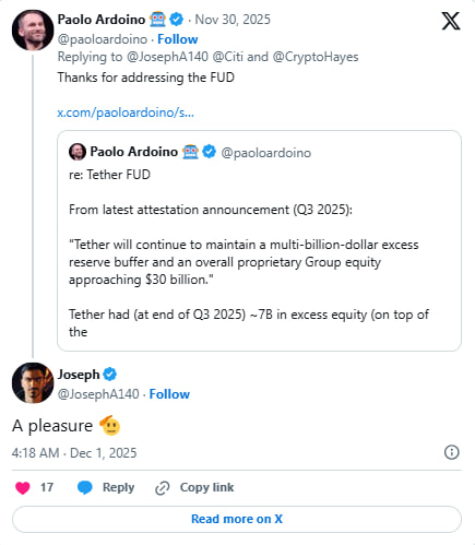 این تحلیل باعث شد بسیاری از فعالان بازار در شبکههای اجتماعی از تتر دفاع کنند؛ از جمله مدیرعامل این شرکت، پائولو آردوئینو.