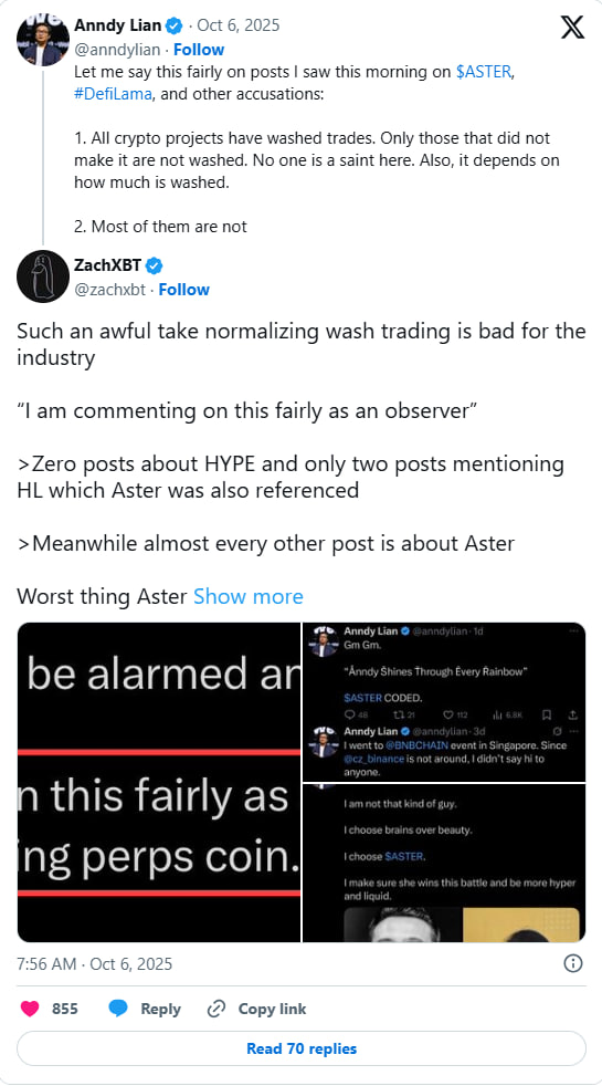 وبسایت تحلیلی DeFiLlama نیز هفته گذشته دادههای حجمی معاملات Aster را حذف کرد. دلیل این اقدام، شباهت غیرعادی حجم معاملات این پلتفرم با بایننس بود؛ موضوعی که برخی آن را نشانهای از دستکاری حجم معاملات (Wash Trading) دانستهاند.
