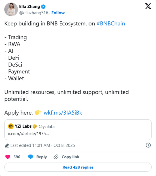 YZi Labs تأکید کرده است که بنیانگذاران میتوانند از زیرساخت سریع و کمهزینه BNB برای توسعه محصولات خود استفاده کنند. این صندوق علاوه بر تأمین سرمایه، ابزارهای توسعه، ارتباط با سرمایهگذاران و دسترسی مستقیم به تیم اصلی BNB Chain را نیز فراهم میکند.
