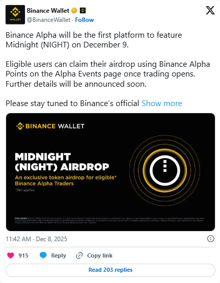 بایننس بهتازگی در حساب رسمی خود اعلام کرد که توکن NIGHT از شبکه Midnight، اولین بار در بایننس آلفا از تاریخ ۱۸ آذر قابل معامله خواهد بود. این لیستینگ تنها یک عرضه ساده نیست؛ کاربران واجد شرایط میتوانند با استفاده از Alpha Points خود توکن NIGHT دریافت کنند و بایننس وعده داده بهزودی اطلاعات بیشتری ارائه کند.