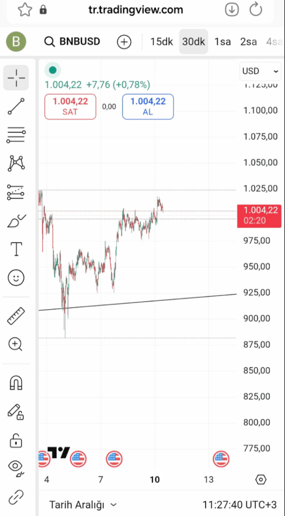 BNB پس از سقوط از سقف سالانهاش، فعلاً در محدوده ۹۷۵ تا ۱۰۲۰ دلار نوسان میکند و طبق دادههای بازار، قیمت لحظهای آن حدود ۱۰۰۴ دلار است. روند فعلی نهتنها باعث فروکشکردن هیجان فروش شده، بلکه با تشکیل کفهای بالاتر، نشان میدهد خریداران همچنان از روند صعودی کوتاهمدت دفاع میکنند.