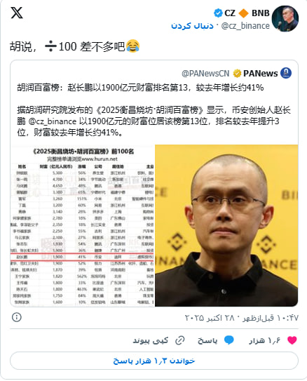 با این حال، CZ در آخرین پست خود در X این رقم را «پوچ» خواند و گفت: «اگر تقسیم بر ۱۰۰ کنید، درست میشود.» اگر حرفش دقیق باشد، ثروت او تنها حدود ۱.۹ میلیارد یوان (~۲۶۰ میلیون دلار) خواهد بود؛ تفاوتی شگفتآور با ارقام رسانهای.