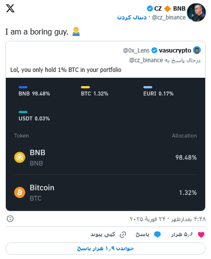 بر اساس پست رسمی بایننس، بیش از ۹۸٪ داراییهای CZ در BNB سرمایهگذاری شده است. بیتکوین تنها ۱.۳٪ و استیبلکوینها EURI و USDT مجموعاً ۰.۲٪ داراییها را تشکیل میدهند.