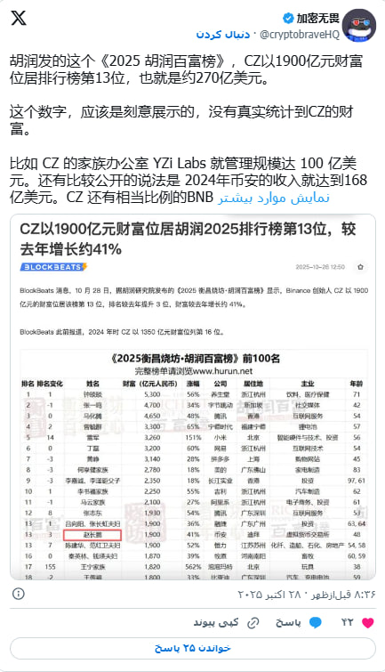 لیست ثروتمندان ۲۰۲۵ هورون، ثروت CZ را ۱۹۰ میلیارد یوان (~۲۶ میلیارد دلار) برآورد کرده و افزایش ۴۱٪ نسبت به سال گذشته را نشان میدهد.