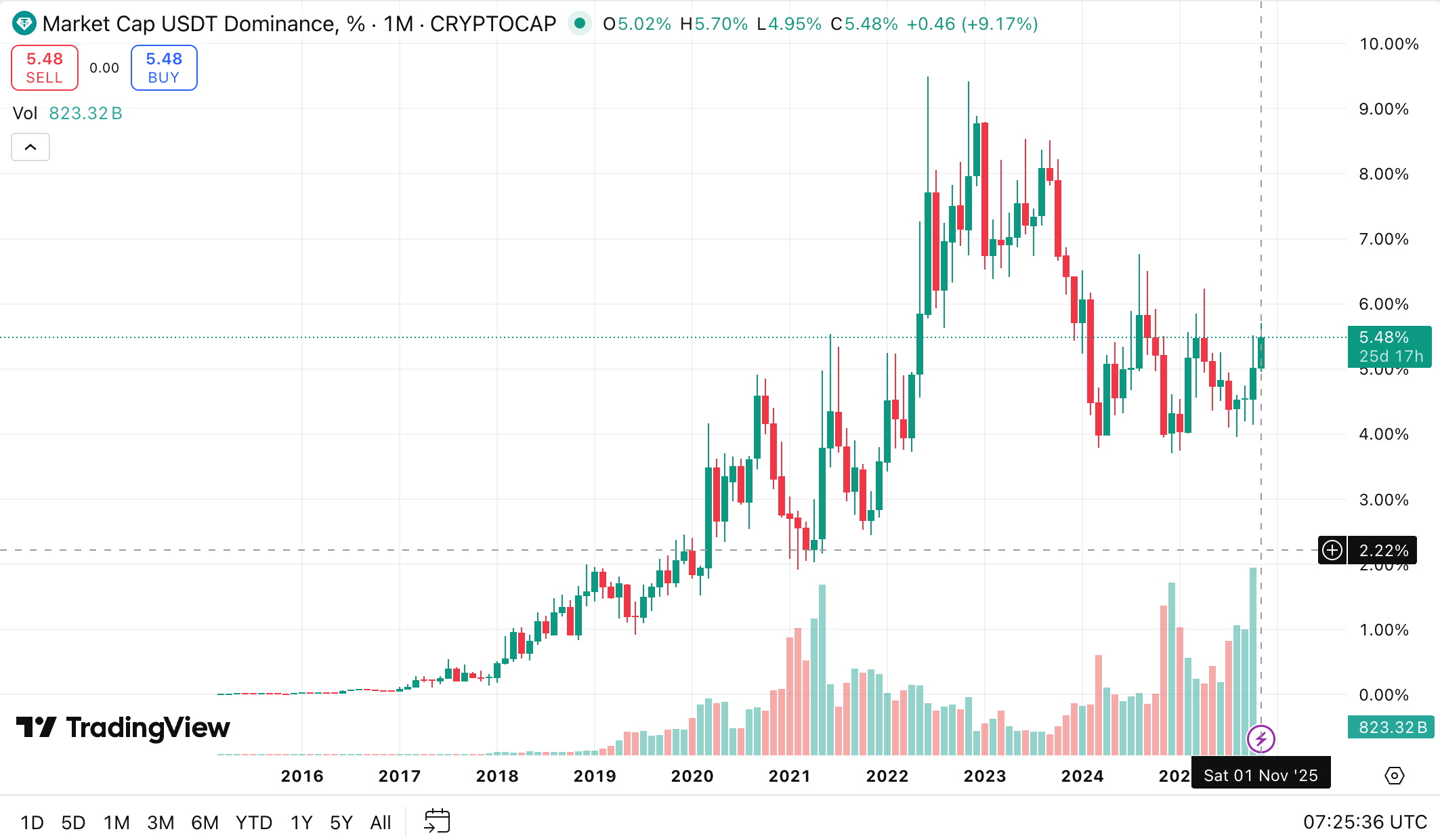 در حالی که بازار رمزارزها هفتهای پرتنش را پشت سر میگذارد، شاخص سلطه تتر (USDT.D) با رشد چشمگیر خود به سطحی رسیده که تحلیلگران آن را یکی از مقاومتهای تاریخی بازار میدانند. طبق دادههای آنچین، این شاخص تنها در ماه اکتبر بیش از ۲۰٪ افزایش یافته؛ نشانهای از مهاجرت گسترده سرمایهگذاران از داراییهای پرریسک به استیبلکوینها.