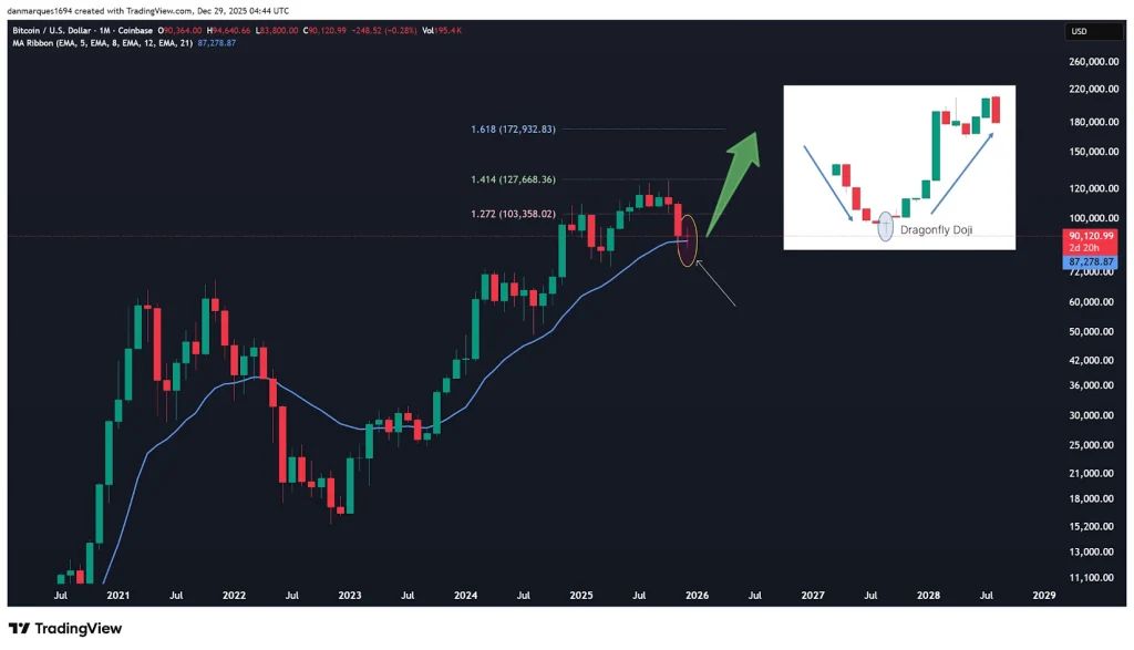 بیتکوین در آستانه بستهشدن ماه دسامبر قرار دارد و نمودار ماهانه در حال شکلدهی به الگوی قدرتمند دراگونفلای دوجی است. این الگو معمولا نشانه بازگشت روند صعودی پس از یک دوره ضعف است و حکایت از حضور خریداران قدرتمند در کفهای قیمتی دارد.