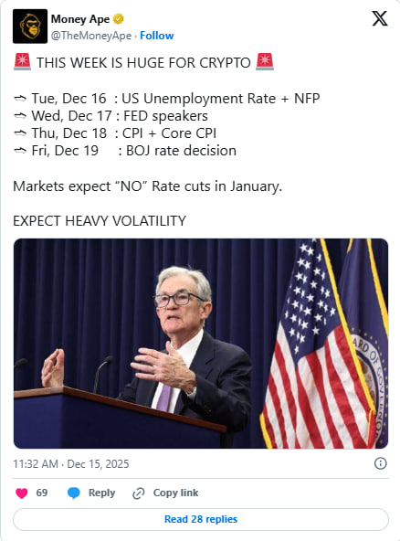 چهارشنبه، ۱۷ دسامبر، چند مقام ارشد فدرال رزرو از جمله کریس والر و استیفن میران سخنرانی خواهند کرد. بازارها احتمال کاهش نرخ بهره در ژانویه را تقریباً صفر میبینند، در حالی که یک ماه پیش این احتمال نزدیک ۲۵٪ بود. هر نشانهای از افزایش نرخ میتواند فشار فروش بر بازار کریپتو وارد کند، اما اظهارات ملایم ممکن است به کاهش موقت نوسانات کمک کند.