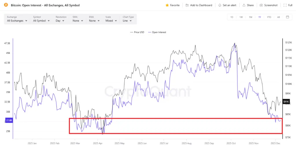 فارغ از روایتها، دادههای کلیدی بازار آتی بیتکوین یک فرصت بالقوه برای حرکت پایدار بعدی ارائه میکند. طبق تحلیل کریپتوکوانت، میزان بهره باز در قراردادهای آتی بیتکوین به کمترین سطح خود در سال جاری رسیده است. این کاهش شدید از اوجهایی که همزمان با ثبت بالاترین قیمت تاریخ بیتکوین در اوایل ۲۰۲۵ وجود داشت، فاصله گرفته است. تحلیلگر این وضعیت را ترکیبی از capitulation و بیتفاوتی سرمایهگذاران میداند.