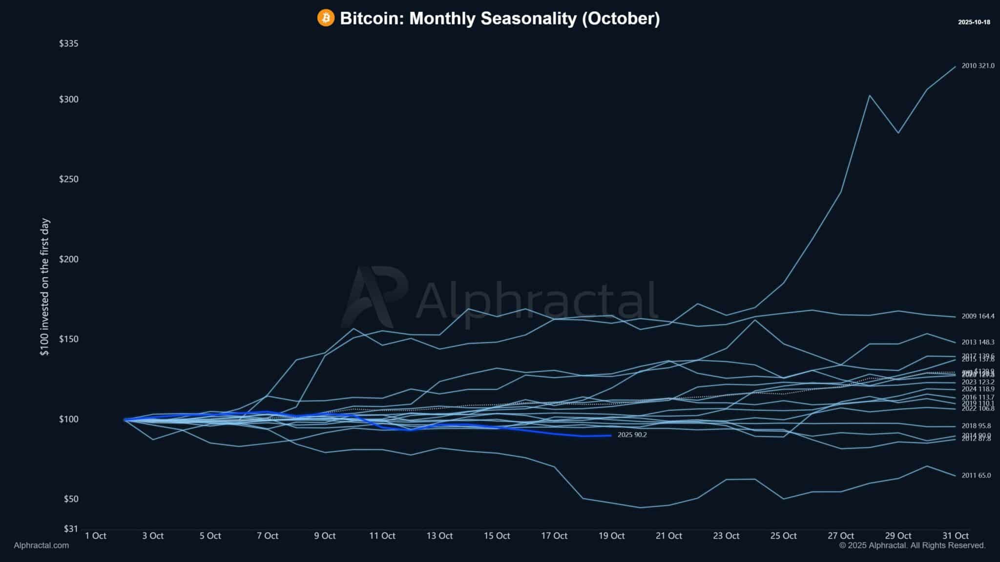 ماه اکتبر ۲۰۲۵ تا اینجا به دومین بدترین اکتبر بیتکوین در تاریخ تبدیل شده است؛ اتفاقی غیرمنتظره برای ماهی که معمولاً با رشد و رنگ سبز شناخته میشود.