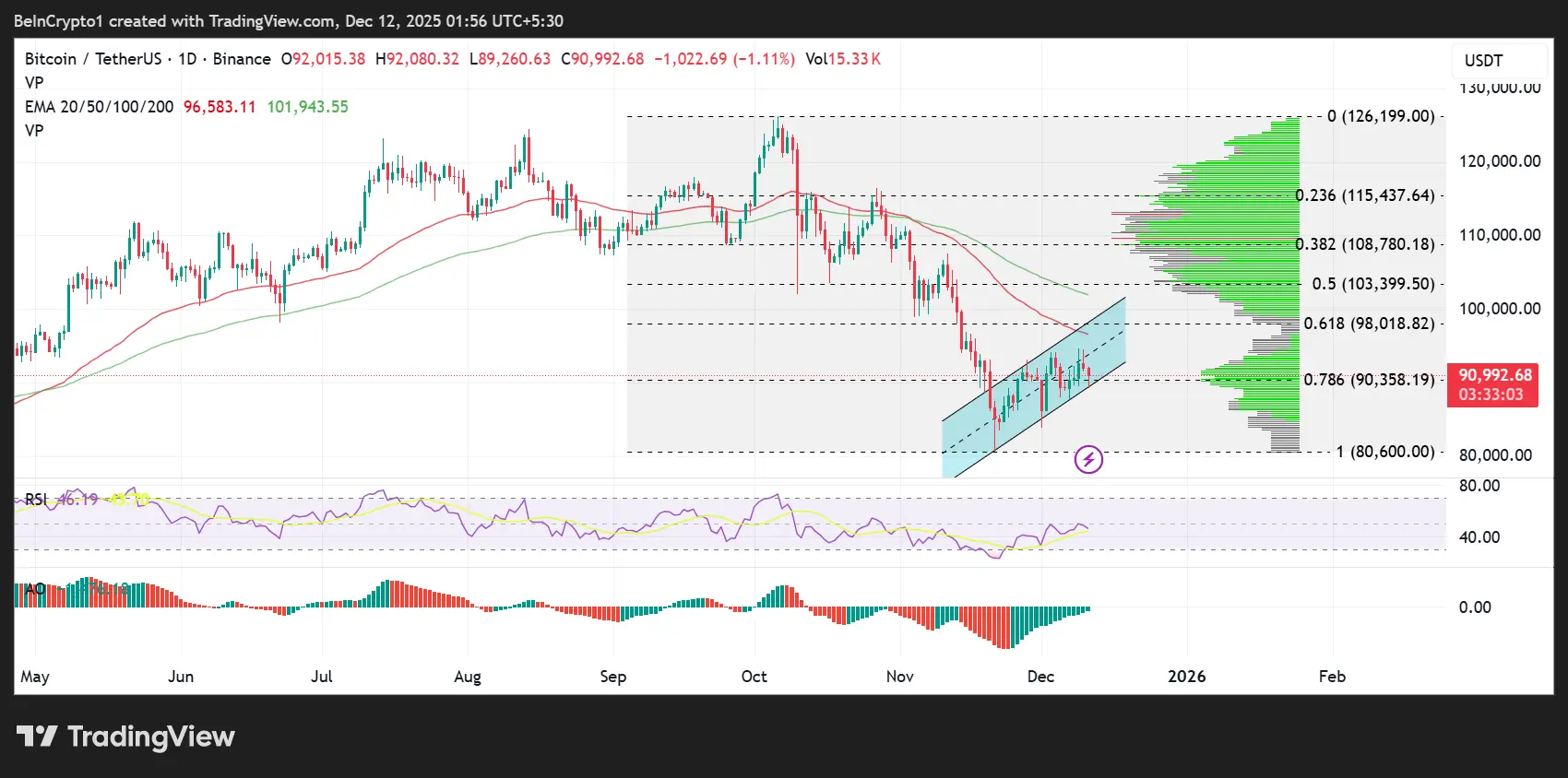 در نمودار روزانه بیتکوین، روند قیمت نشاندهنده بازیابی آرام درون یک کانال صعودی مشخص است که پس از اصلاح شدید از سقفهای اوایل اکتبر شکل گرفته است.