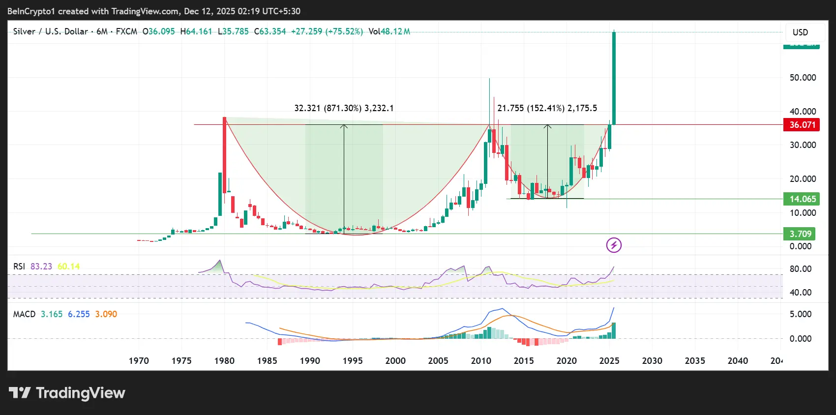 قسمت فنجان از اوج سال ۱۹۸۰ تا سقف سال ۲۰۱۱ امتداد دارد و حرکتی معادل ۸۷۱ درصد را پوشش میدهد. بخش دسته نیز بین سالهای ۲۰۱۱ تا ۲۰۲۴ شکل گرفته و حدود ۱۵۲ درصد اندازه حرکت دارد. هر دو بخش در سطح مقاومتی نزدیک به ۳۶ دلار به هم میرسند — سطحی که نقره طی بیش از ۴۰ سال قادر به عبور از آن نبود.