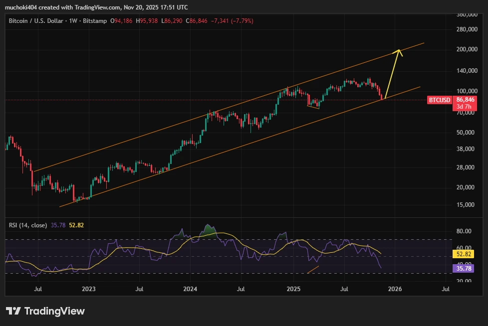 در بازه هفتگی، بیتکوین از اوایل ۲۰۲۳ در یک کانال صعودی متقارن حرکت میکرد. پس از ثبت اوج تاریخی حدود ۱۲۶ هزار دلار در ماه اکتبر، قیمت بیتکوین وارد فاز اصلاحی شد و اکنون در حال بازآزمایی نوار پایینی این کانال صعودی ماکرو است که یک سطح نقدینگی بسیار مهم به شمار میآید.