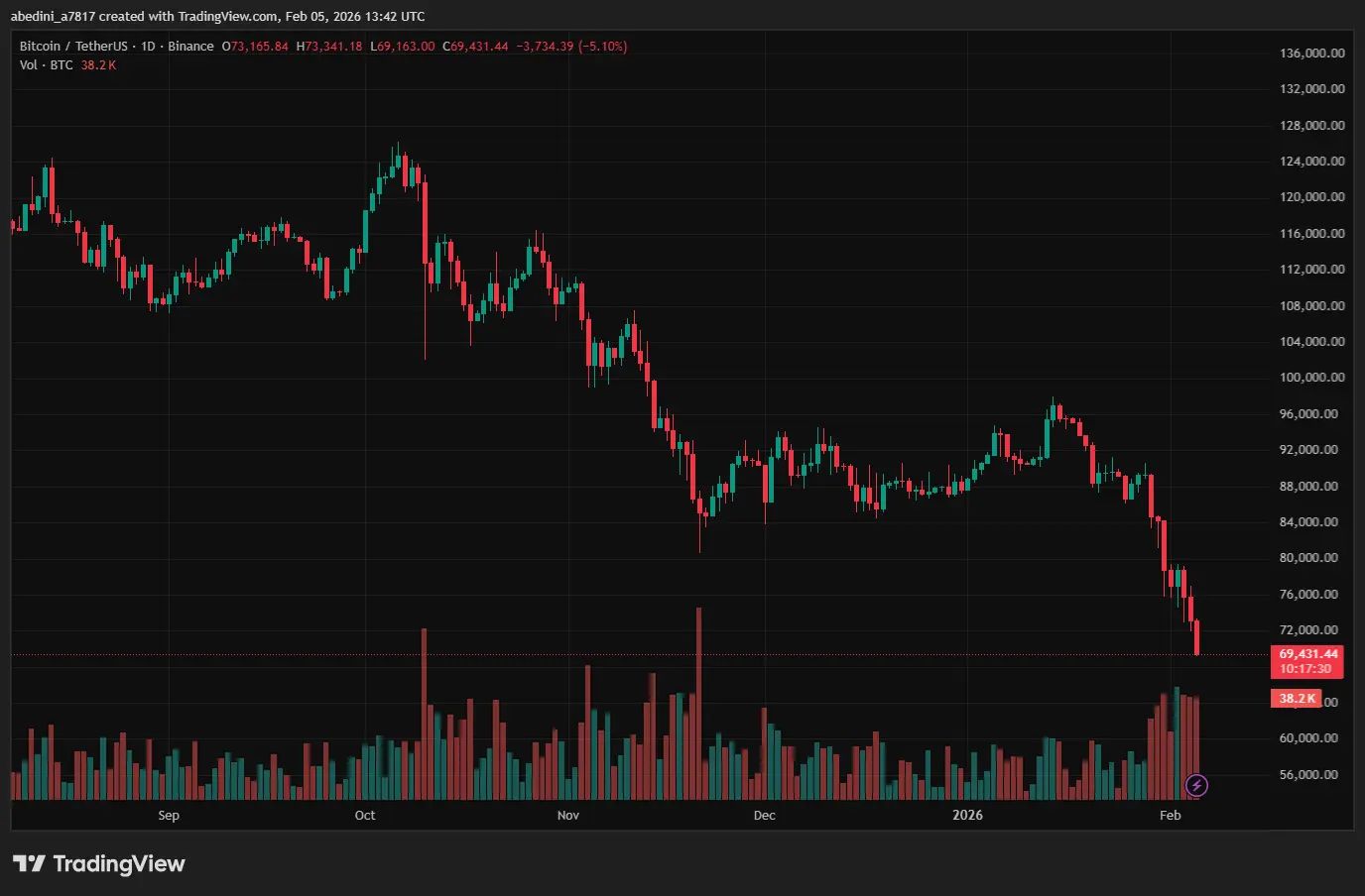 بیتکوین در تاریخ ۵ فوریه ۲۰۲۶ با ریزشی تند روبهرو شد و برای مدت کوتاهی به زیر سطح ۶۹ هزار دلار سقوط کرد، پیش از آنکه دوباره در محدوده نزدیک به ۷۰ هزار دلار تثبیت شود.