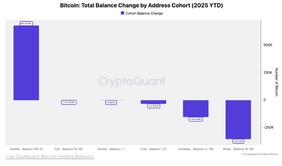 همچنین دادههای CryptoQuant نشان میدهد که گروه «دلفینها» کیفپولهایی که بین ۱۰۰ تا ۱۰۰۰ بیتکوین دارند ۲۶٪ از عرضه کل بیتکوین را در اختیار دارند و در سال جاری ۶۸۱ هزار واحد بیتکوین جدید به دارایی خود افزودهاند.