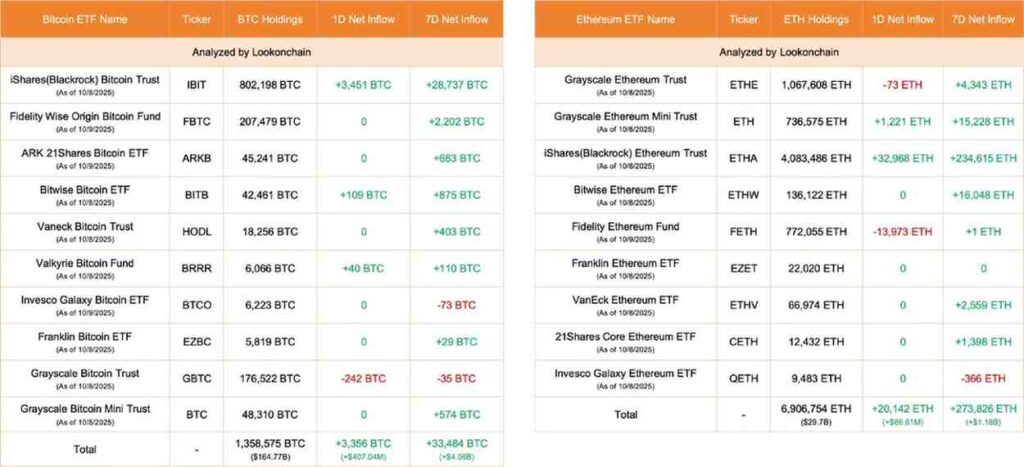 طبق دادههای پلتفرم Lookonchain، ۱۰ صندوق ETF بیتکوین در مجموع شاهد ورود بیش از ۳,۳۵۶ بیتکوین (حدود ۴۰۷ میلیون دلار) بودهاند که بلکراک با جذب ۳,۴۵۱ بیتکوین (۴۱۸ میلیون دلار) بیشترین سهم را به خود اختصاص داده است. در این میان تنها صندوق Grayscale خروج سرمایه گزارش کرده است.