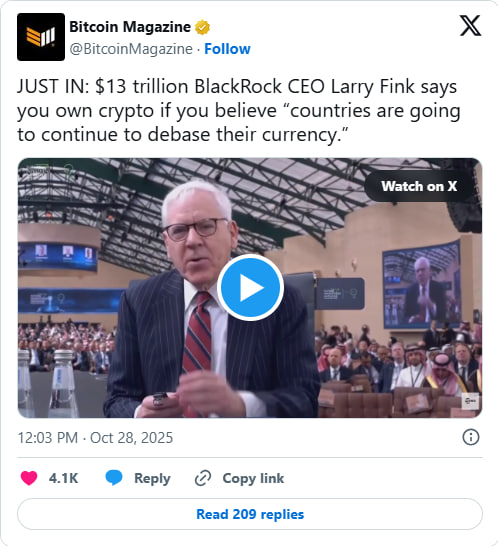 حتی لری فینک، مدیرعامل بلکراک، پیشبینی کرده در صورت تداوم ورود سرمایه نهادی، قیمت بیتکوین میتواند به ۷۰۰ هزار دلار برسد. او گفته بود: