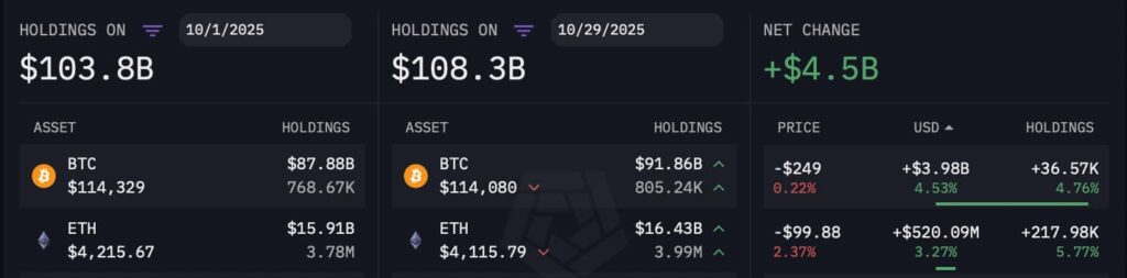 دادههای زنجیرهای نشان میدهد بلکراک بین ۱ تا ۲۹ اکتبر ۲۰۲۵ نیز دست از خرید برنداشته است. دارایی دیجیتال این شرکت از ۱۰۳.۸ میلیارد دلار به ۱۰۸.۳ میلیارد دلار افزایش یافته؛ یعنی تنها در کمتر از یک ماه، بیش از ۳۶٬۵۷۰ بیتکوین (حدود ۳.۹۸ میلیارد دلار) و ۲۱۸ هزار اتریوم (نزدیک به ۵۲۰ میلیون دلار) به سبد خود افزوده است.