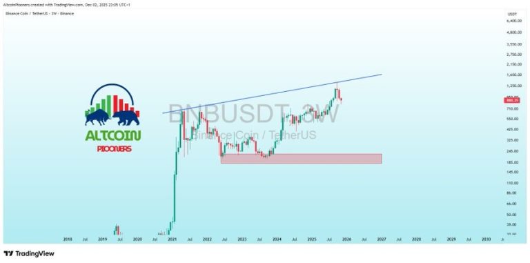 افزایش هفت درصدی هفته گذشته تنها یک تکانه مقطعی نبود. تحلیلگران میگویند BNB در تایم فریم سههفتهای داخل یک کانال صعودی طولانیمدت قرار دارد که بیش از هفت سال است مسیر رشد قیمت را مشخص میکند. اکنون قیمت برای ششمین بار به سقف این کانال رسیده و همین برخورد تازه دوباره احتمال آغاز یک فاز صعودی را زنده کرده است.
