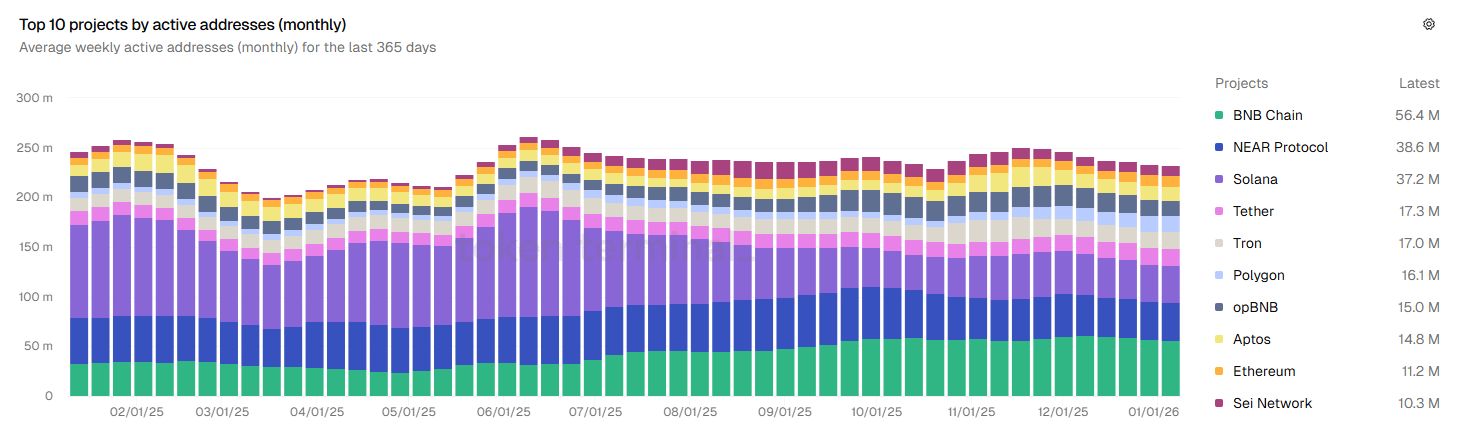 در نگاه اول ممکن است حضور سرمایهگذاران خرد در بازار اسپات چندان پررنگ نباشد، اما آمار استفاده از شبکه چیز دیگری میگوید. طبق دادههای Token Terminal، اوایل سال ۲۰۲۶ تعداد آدرسهای فعال هفتگی BNB Chain بهطور میانگین به ۵۶.۴ میلیون رسیده است.