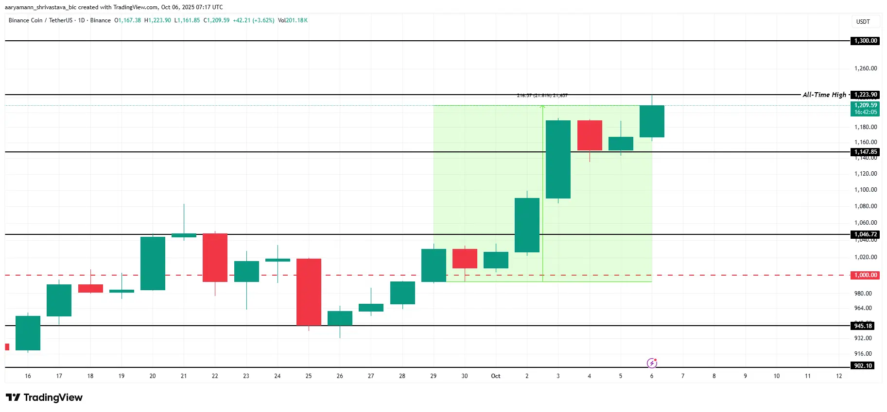 در حال حاضر، قیمت BNB در سطح ۱٬۲۰۹ دلار معامله میشود و به تازگی با رسیدن به ۱٬۲۲۳ دلار، سقف تاریخی جدیدی ثبت کرده است. این جهش پس از بازگشت قوی از سطح حمایتی ۱٬۱۴۷ دلار در هفته گذشته رقم خورد و نشانهای از اعتماد مداوم سرمایهگذاران به این رمزارز است.