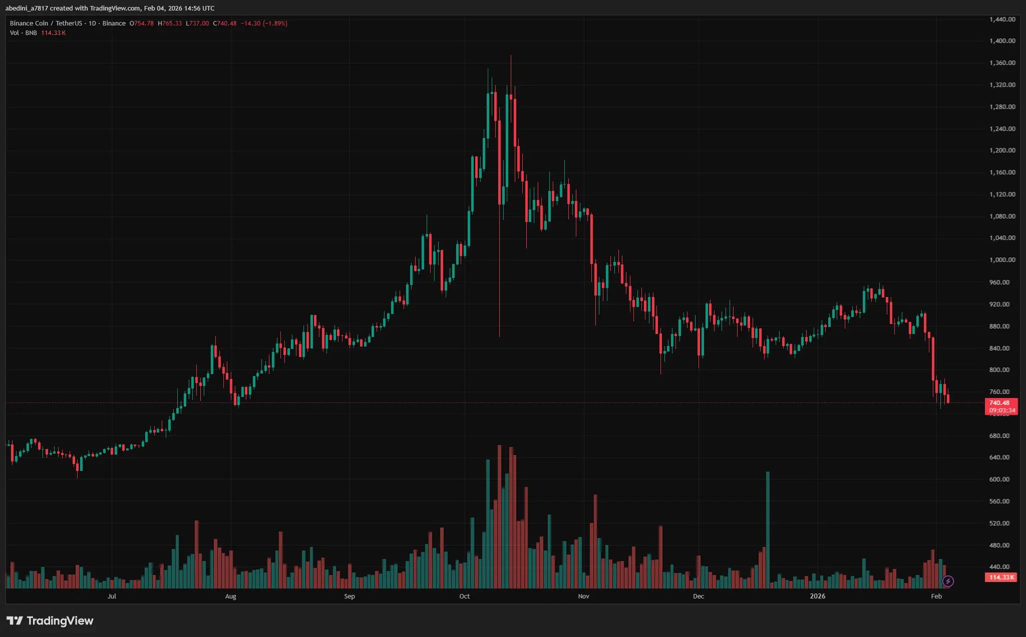 یک معاملهگر ارز دیجیتال با نام Broke Doomer تصویری از نمودار BNB در برابر تتر را در پلتفرم TradingView منتشر کرد. این نمودار در تایمفریم ۱۵ دقیقهای نشان میداد که ساختار قیمت نسبت به سایر بازارها بسیار شفافتر است و میتوان بهراحتی بر اساس آن برنامه معاملاتی طراحی کرد.