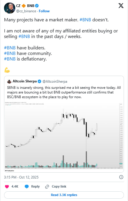 او تأکید کرد که ارزش واقعی این رمزارز از جامعه فعال، توسعه مداوم زنجیره BNB Chain و سیاست توکنسوزی مستمر سرچشمه میگیرد، نه از حمایت مصنوعی یا معاملات هماهنگ.