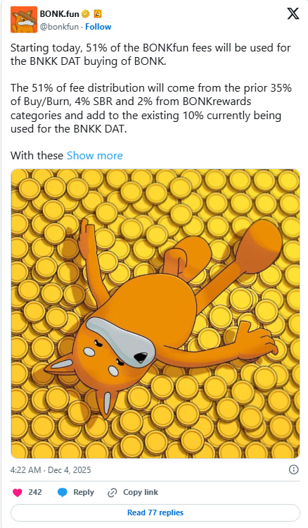 این تغییر پس از خرید ۳۲ میلیون دلاری BONK توسط BNKK در اکتبر و راهاندازی رسمی DAT صورت گرفت. BNKK اخیراً با گرفتن سهم عمدهای از درآمد Bonk.fun به ارزش حدود ۳۰ میلیون دلار، نفوذ خود در اکوسیستم را افزایش داده است.