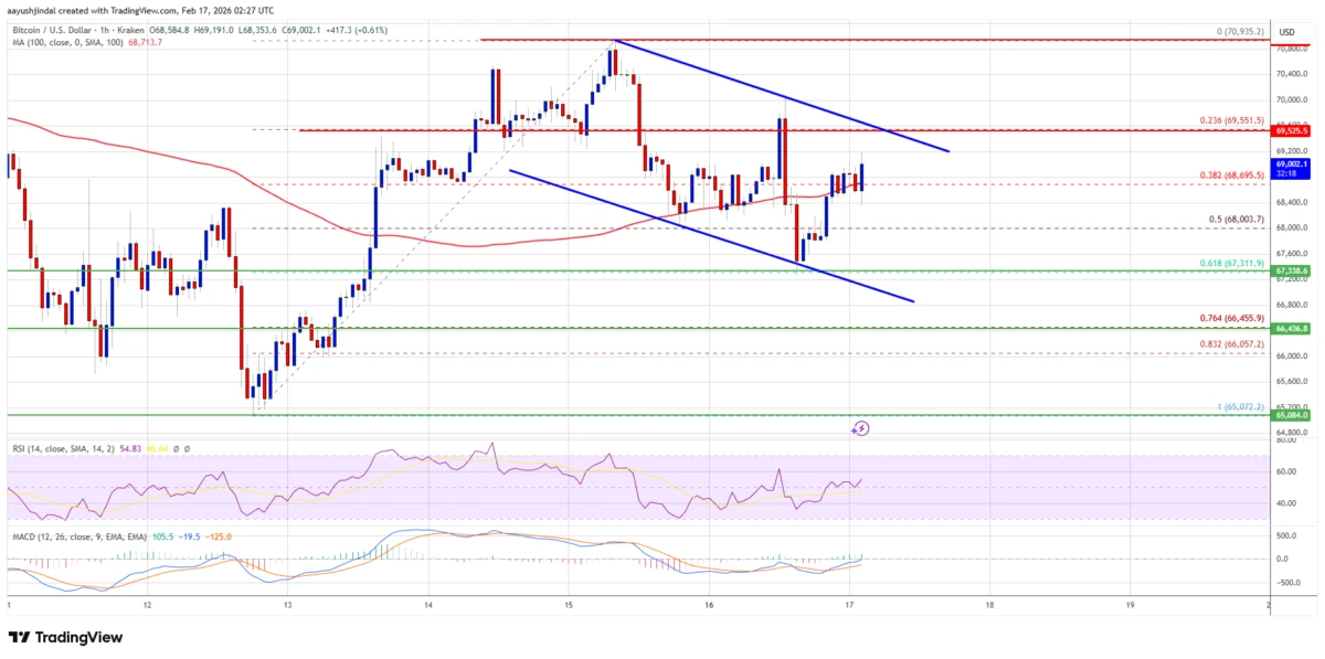 اکنون قیمت دوباره به بالای ۶۸۵۰۰ دلار رسیده و بالاتر از میانگین متحرک ساده ۱۰۰ ساعته معامله می شود. این نشانه ای است که بازار هنوز تمایل به حفظ روند صعودی دارد، اما مسیر صعود کاملا هموار نیست.