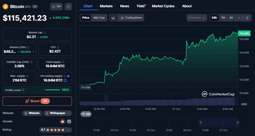 در ادامه، گاوها موفق شدند قیمت را بالاتر از ۱۱۳,۵۰۰ دلار و میانگین متحرک ساده ۱۰۰ ساعته حفظ کنند. در نهایت، قیمت از سطح ۱۱۵,۰۰۰ دلار نیز فراتر رفت و اکنون در حال تثبیت سودهای خود بالاتر از سطح اصلاحی فیبوناچی ۲۳.۶ درصد از حرکت صعودی اخیر (از کف ۱۰۶,۷۱۸ دلار تا سقف ۱۱۵,۴۰۰ دلار) قرار دارد.