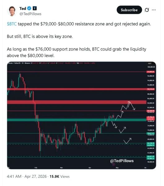 در همین حال، تحلیلگر دیگری معتقد است تا زمانی که سطح حمایتی ۷۶ هزار دلار حفظ شود، احتمال حمله دوباره به محدوده ۸۰ هزار دلار وجود دارد.