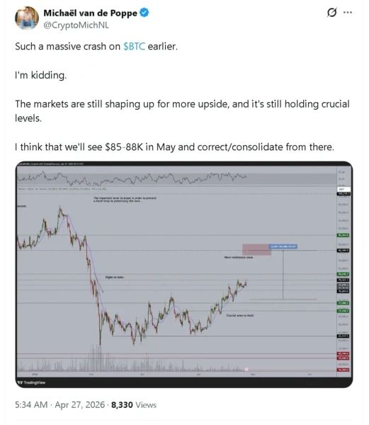 با وجود افت اخیر، برخی تحلیلگران همچنان دیدگاه مثبتی دارند. به گفته مایکل ون د پوپه، بازار هنوز پتانسیل رشد دارد و بیتکوین میتواند در ماه می به محدوده ۸۵ تا ۸۸ هزار دلار برسد.