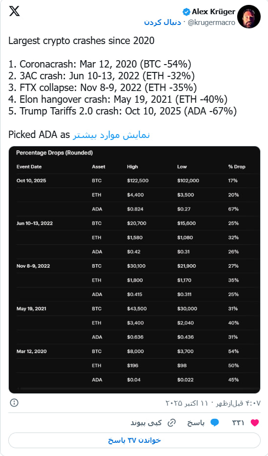 تا عصر روز گذشته، ADA حوالی ۰.۸۵ دلار معامله میشد و برخی تحلیلگران حتی از احتمال رشد آن تا ۱ یا ۲ دلار سخن میگفتند. اما تنها چند ساعت کافی بود تا امیدها به کابوس تبدیل شوند.