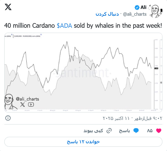 دادههای منتشرشده از سوی تحلیلگر «علی مارتینز» نشان میدهد که نهنگهای کاردانو در هفته گذشته بیش از ۴۰ میلیون ADA فروختهاند. این حجم سنگین فروش، فشار نزولی را افزایش داده و نگرانیها درباره ادامه ریزش را بیشتر کرده است.
