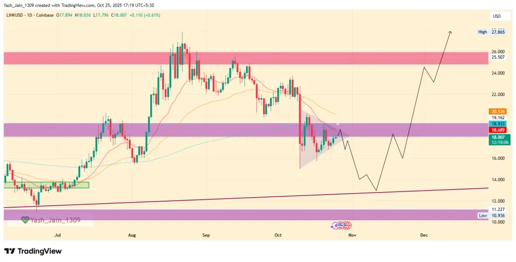 این ساختار نموداری تاکنون چندین بار مسیر حرکتی چینلینک را تعیین کرده و آخرین برخورد با میانه این کانال در ماه سپتامبر باعث شناسایی سود و اصلاح قیمت شد. الگوی فعلی نشان میدهد که احتمال دارد قیمت LINK از مثلث متقارن خارج شده و ناحیه حمایتی ۱۳.۵۰ تا ۱۴.۵۰ دلار را دوباره لمس کند؛ محدودهای که با کف مثلث همتراز است. بهطور تاریخی، چنین مناطق حمایتی معمولاً نقطه آغاز جهشهای قوی در چرخههای قیمتی چینلینک بودهاند.