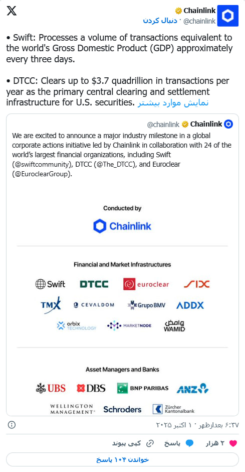 رشد اخیر تنها به تحلیل تکنیکال محدود نمیشود. چینلینک با معرفی «LINK Reserves» و همکاری با شرکتهای بزرگی چون Swift و UBS، جایگاه خود در حوزه RWA را تقویت کرده است. همچنین بازار در انتظار بررسی ETFهای مرتبط با چینلینک است که تأیید احتمالی آنها میتواند به عنوان یک محرک قدرتمند عمل کند.