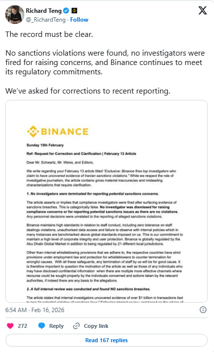 ریچارد تنگ، مدیرعامل مشترک بایننس، با قاطعیت اعلام کرد که هیچ تخلف تحریمی رخ نداده و کارکنان به خاطر گزارش نگرانیهای انطباق اخراج نشدهاند. بایننس در پاسخ رسمی خود گفت که بررسیهای داخلی و با پشتیبانی مشاوران حقوقی خارجی هیچ مدرکی مبنی بر نقض تحریمها پیدا نکرده است و سیستمهای محافظت از افشاگران را در چندین حوزه قضایی رعایت میکند.