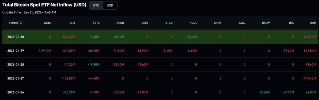 بررسی دادهها نشان میدهد بلکراک در بازه ۲۶ تا ۳۰ ژانویه، حدود ۹۴۷ میلیون دلار بیتکوین را از طریق صندوق ETF خود با نماد IBIT فروخته است. اوج فشار فروش در روزهای پایانی هفته رقم خورد؛ جایی که تنها در ۲۹ ژانویه بیش از ۳۱۸ میلیون دلار و یک روز بعد ۵۲۸ میلیون دلار خروج سرمایه ثبت شد.
