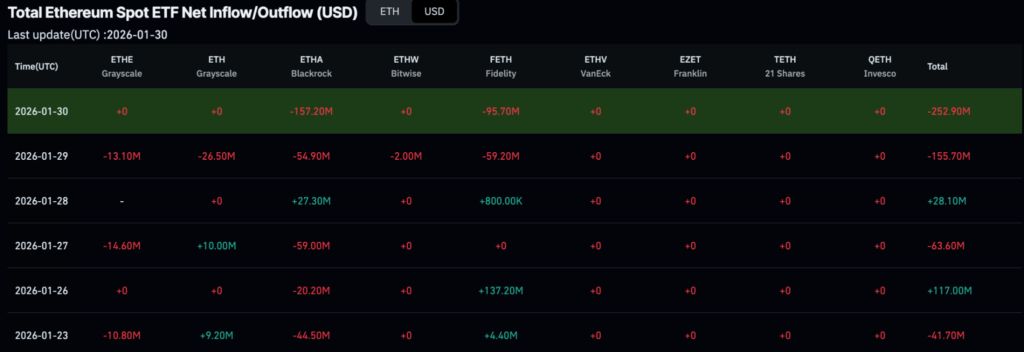 اتریوم نیز مسیر مشابهی را طی کرد، هرچند در ابعادی کوچکتر. صندوق ETHA بلکراک طی همان هفته حدود ۲۶۴ میلیون دلار خروج سرمایه را ثبت کرد. تنها در ۳۰ ژانویه، بیش از ۱۵۷ میلیون دلار اتریوم از این صندوق خارج شد؛ عددی که پس از خروج ۵۵ میلیون دلاری روز قبل، فشار فروش را به اوج رساند.