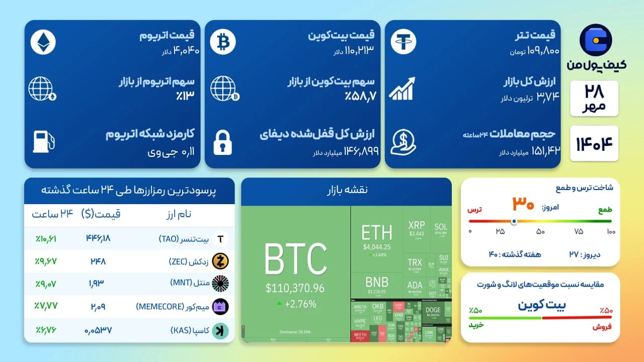 بازار امروز در فاز «تثبیت آرام» قرار دارد. حمایت بیتکوین در محدودهی ۱۱۰ هزار دلار و کارمزد بسیار پایین اتریوم، فضای مناسبی برای معاملات کمهزینه فراهم کرده است. رشد برخی آلتکوینها (مثل TAO) و افزایش تدریجی شاخص طمع، نشانههایی از پایداری ساختاری بازار در دل نوسانات کوتاهمدت هستند.
