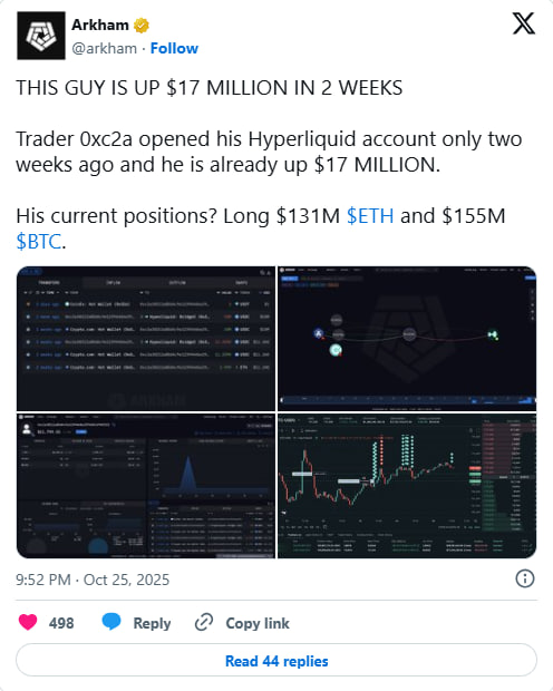 در حالی که بیشتر معاملهگران بازار رمزارز در ماه اکتبر بیش از ۲۰ میلیارد دلار ضرر کردند، یک معاملهگر حرفهای با نام مستعار «0xc2a» توانست از بازگشت ناگهانی بیتکوین و اتریوم حدود ۱۷ میلیون دلار سود کسب کند. اقدام بهموقع او در میان آشفتگی بازار، بار دیگر قدرت استراتژی دقیق و مدیریت ریسک را نشان داد.