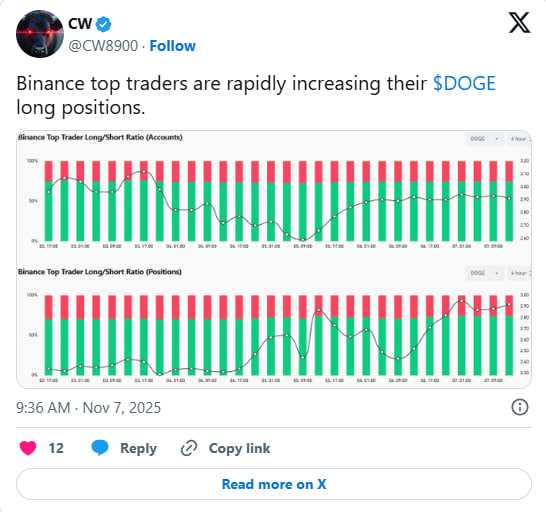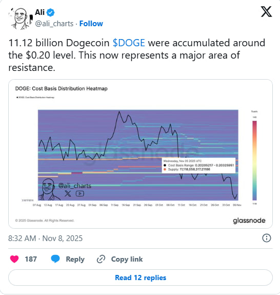 تحلیلگر مشهور کریپتو، علی مارتینز، تأکید کرده که سطح ۰.۲۰ دلار مقاومت جدی دوجکوین است. بیش از ۱۱ میلیون توکن در این محدوده انباشت شدهاند و سرمایهگذارانی که پیشتر در این سطح وارد بازار شدهاند، ممکن است در صورت بازگشت قیمت، برای کسب سود نقدی اقدام کنند.