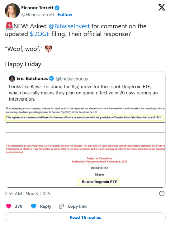 دوجکوین، که یکی از محبوبترین آلتکوینهای بزرگ بهشمار میرود، با جهش سریع قیمت در روز گذشته توانست توجه بازار را جلب کند. این رشد پس از اعلام بهروزرسانی پرونده ETF توسط Bitwise رخ داد، که دوره ۲۰ روزه اثرگذاری خودکار را فعال کرد و شانس راهاندازی این محصول مالی را افزایش داد.