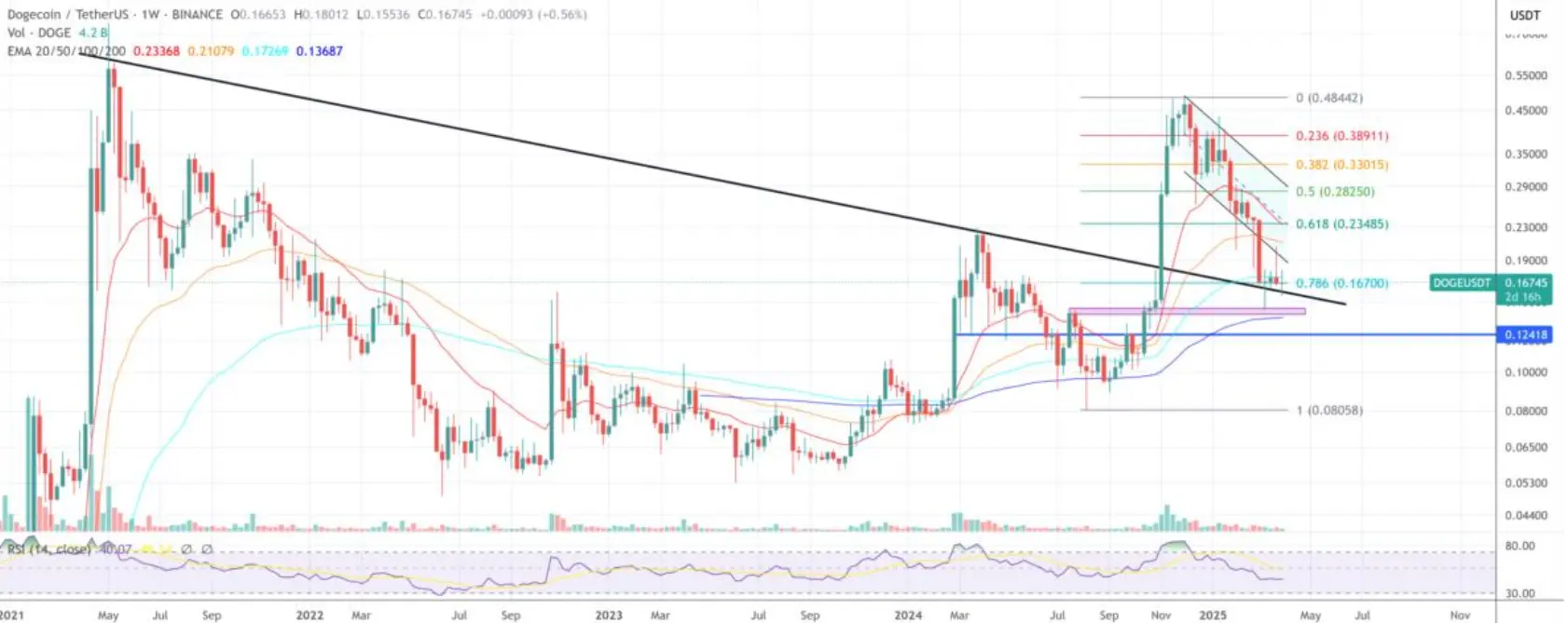 در نمودار هفتگی، خط روند به سمت پایین حرکت میکند، از سطحهای تاریخی بالای اوجهای دوره قبلی و همراستا با سطح 0.786 فیبوناچی در حدود 0.167 دلار است. Dogecoin در وضعیت شکنندهای قرار دارد؛ چرا که از سطح 0.167 دلار پایین آمده اما هنوز به خط روند چند ساله خود که در حدود 0.157 دلار قرار دارد، چسبیده است.