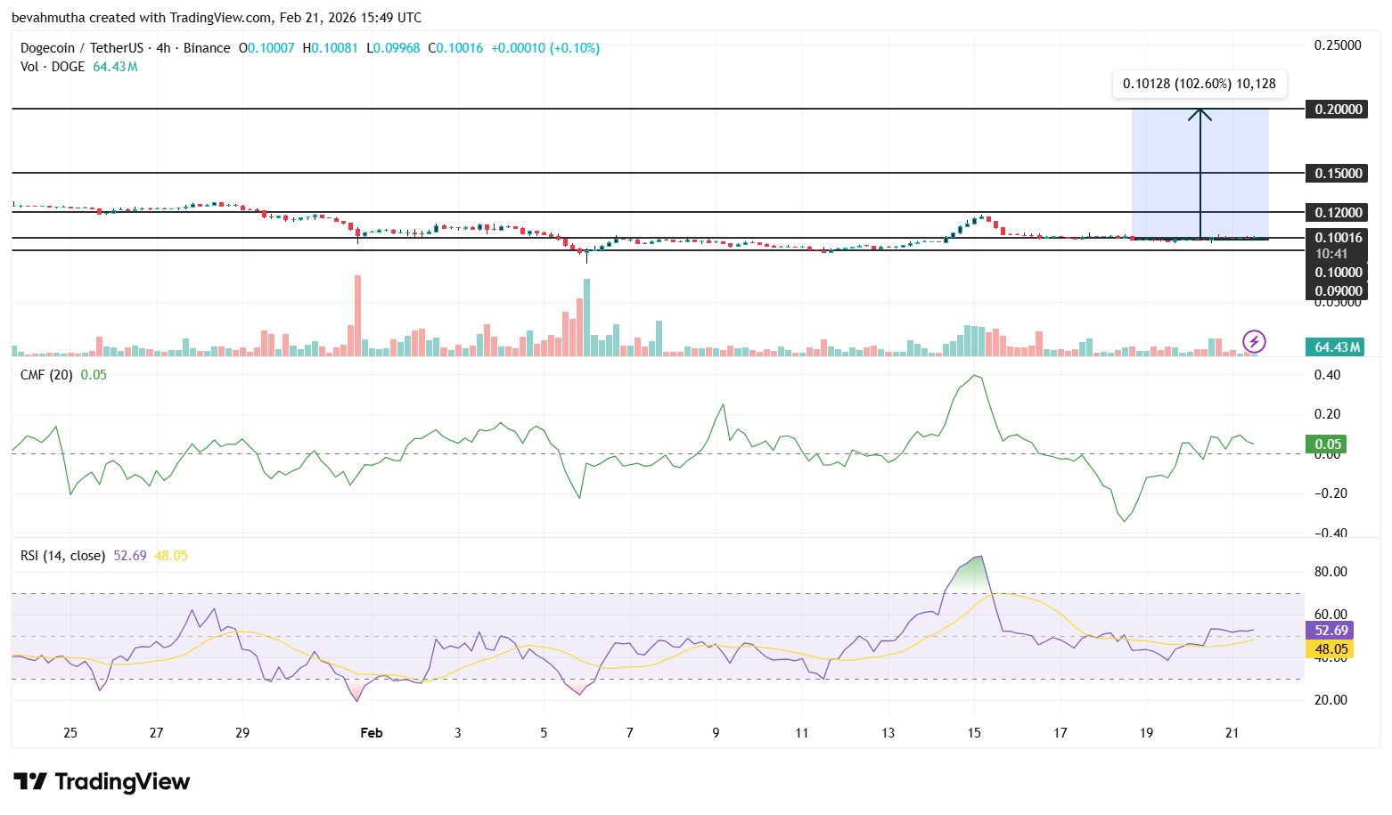 قیمت دوجکوین در فوریه ۲۰۲۶ بالای ۰٫۱۰ دلار تثبیت شده و نشانههای تکنیکال مانند الگوی فنجان و دسته و افزایش انباشت نهنگها احتمال شکست صعودی را تقویت کردهاند. عبور از ۰٫۱۲ دلار میتواند راه را برای اهداف بالاتر تا ۰٫۲۰ دلار هموار کند.