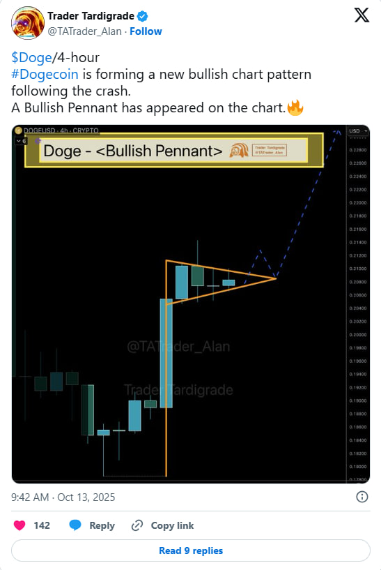در ادامهی حرکت، قیمت دوجکوین الگویی شبیه به پرچم صعودی (Bullish Pennant) تشکیل داده است؛ الگویی که معمولاً پیش از ادامهی روند صعودی ظاهر میشود. طبق تحلیلها، شکست مقاومت ۰.۲۲ دلار میتواند مسیر را برای رشد بیشتر باز کند.