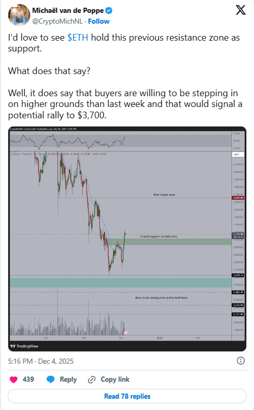 قیمت اتریوم اکنون حوالی ۳۱۴۰ دلار معامله میشود. این محدوده پیشتر نقش مقاومت داشته و حالا بازار در حال آزمایش آن به عنوان حمایت جدید است. تحلیلگران باور دارند که تثبیت اتریوم در همین محدوده میتواند آغاز موج صعودی تازه باشد و قیمت را به سمت هدف بعدی یعنی ۳۷۰۰ دلار سوق دهد.