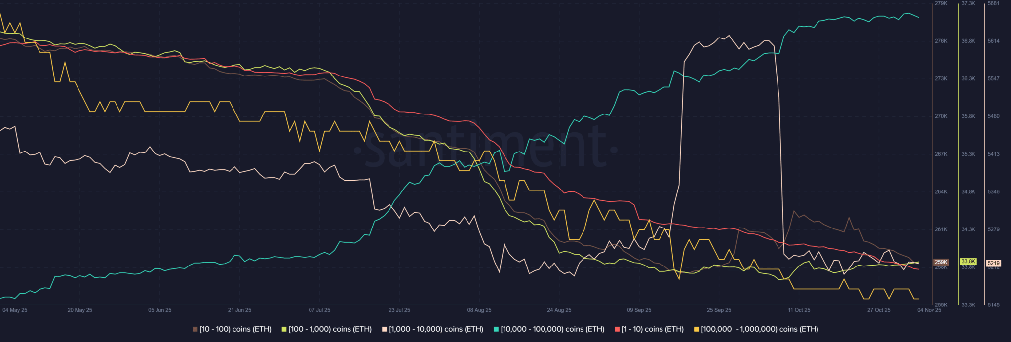 دادههای پلتفرم Santiment نشان میدهد در حالی که بیشتر کیفپولهای بزرگ در هفتههای اخیر مشغول فروش اتریوم بودهاند، تنها یک گروه خاص از نهنگها (دارای ۱۰ تا ۱۰۰ هزار ETH) در مسیر مخالف حرکت کردهاند.