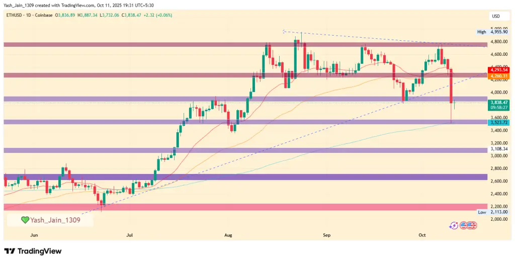 با وجود این سقوط، اتریوم توانست اندکی بالاتر از سطح ۳۸۰۰ دلار تثبیت شود؛ جایی که خریداران در سطوح حمایتی مهم فنی وارد بازار شدند و مانع از ادامه ریزش شدید شدند.