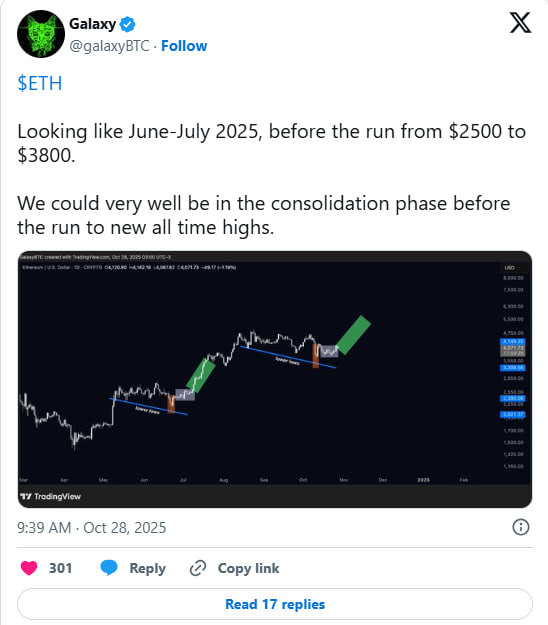 در همین حال، تحلیلگر دیگری با نام Crypto Rover نیز ساختار فعلی را به نمودار سال ۲۰۲۰ تشبیه کرده؛ زمانیکه اتریوم پس از دورهای سکون، در نوامبر آن سال از محدوده مقاومت عبور کرد و یک روند صعودی چندماهه را آغاز نمود. به گفته او، الگوی کانال نزولی فعلی شباهت زیادی به همان ساختار پیش از شکست ۲۰۲۰ دارد و احتمال تکرار آن در اواخر اکتبر تا اوایل نوامبر وجود دارد.